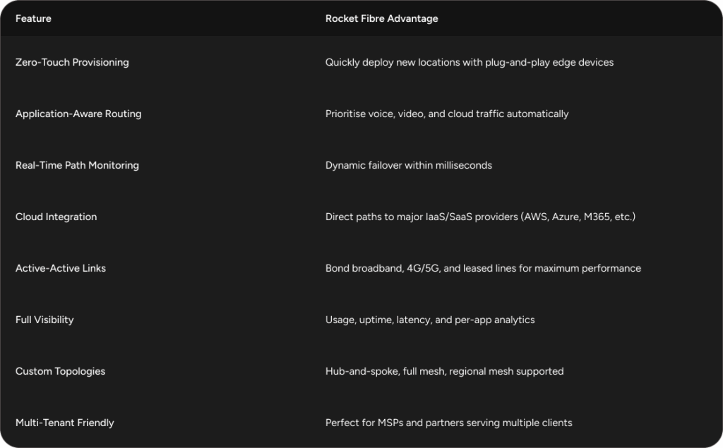Let Rocket Fibre design a scalable, secure, and high-performance SD-WAN solution tailored to your business. Contact us today for a demo, trial deployment, or solution design session.