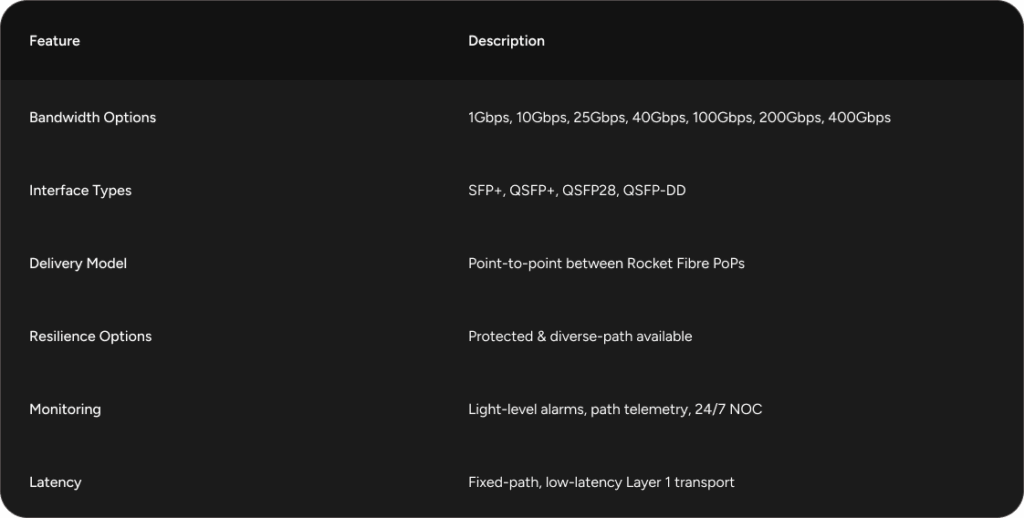 Rocket Fibre delivers high-performance, low-latency Layer 2 Point-to-Point (P2P) connectivity between any of our on-net locations. Built on our carrier-grade Juniper MX architecture, these circuits provide transparent, secure Ethernet transport — supporting EVPN, pseudowires, and advanced encapsulations for modern, scalable networking.